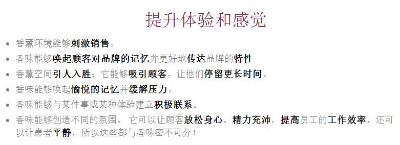 并创造舒适怡人的室内氛围,从而增强顾客或宾客体验。打造公司品牌最重要的一点就是它与品牌香味联系在一起,